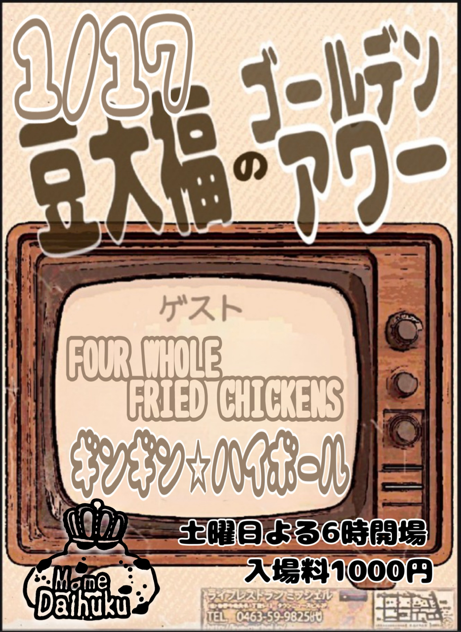 豆大福のゴールデンアワー 1月 17 Sat 2026 夜のライブ 洋楽・邦楽 ジャンルを問わず楽しめる対バンライブです♪ OPEN 17:00 START 18:00 END 20:00 チャージ ¥1,000- ※別途1ドリンク、1フード以上 出演 ・豆大福,FOUR WHOLE FRIED CHICKENS,ギンギン☆ハイボール flyer.jpeg flyer.pdf 前のスケジュール 次のスケジュール