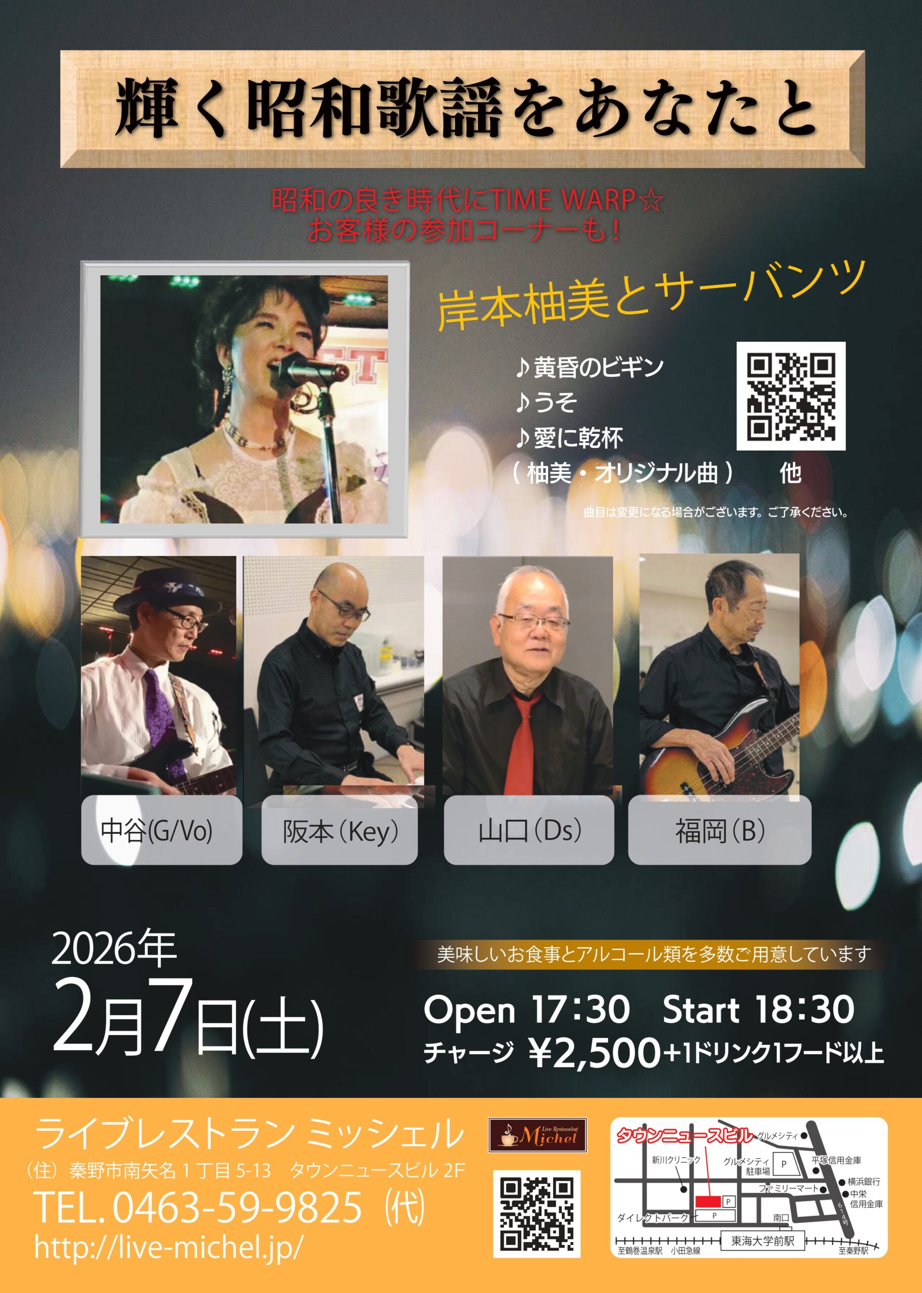 岸本柚美とサーバンツ~輝く昭和歌謡をあなたと~ 2月 7 Sat 2026 夜のライブ 昭和の良き時代にTIME WARP☆ 懐かしいメロディーをお楽しみください♪ OPEN 17:30 START 18:30 END 20:30 チャージ ¥2,500- ※別途1ドリンク、1フード以上 出演 ・岸本柚美(Vo) ・中谷(Gt/Vo) ・阪本(Key) ・山口(Dr) ・栗原(B) flyer.jpeg flyer.pdf 前のスケジュール 次のスケジュール