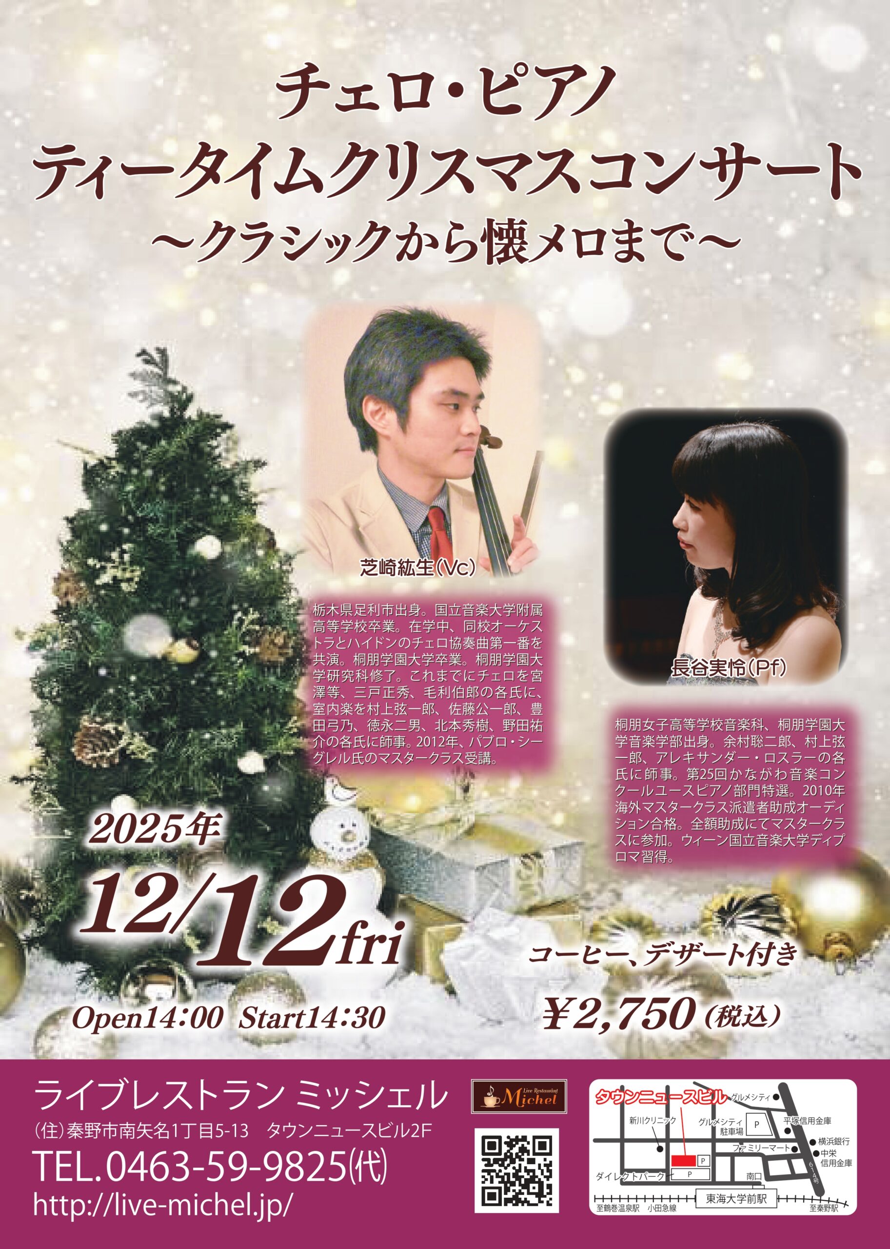 チェロ・ピアノ ティータイムクリスマスコンサート 12月 12 Fri 2025 ティータイムコンサート お馴染みチェロ奏者の芝崎紘生さんを迎え、 癒しの響きに包まれるティータイムコンサート。 クリスマスの名曲もお楽しみに! OPEN 14:00 START 14:30 END 15:30 チャージ ¥2,750-(コーヒー・デザート付き) 出演 ・芝崎紘生(Vc) ・長谷実怜(Pf) flyer.jpeg flyer.pdf 前のスケジュール 次のスケジュール