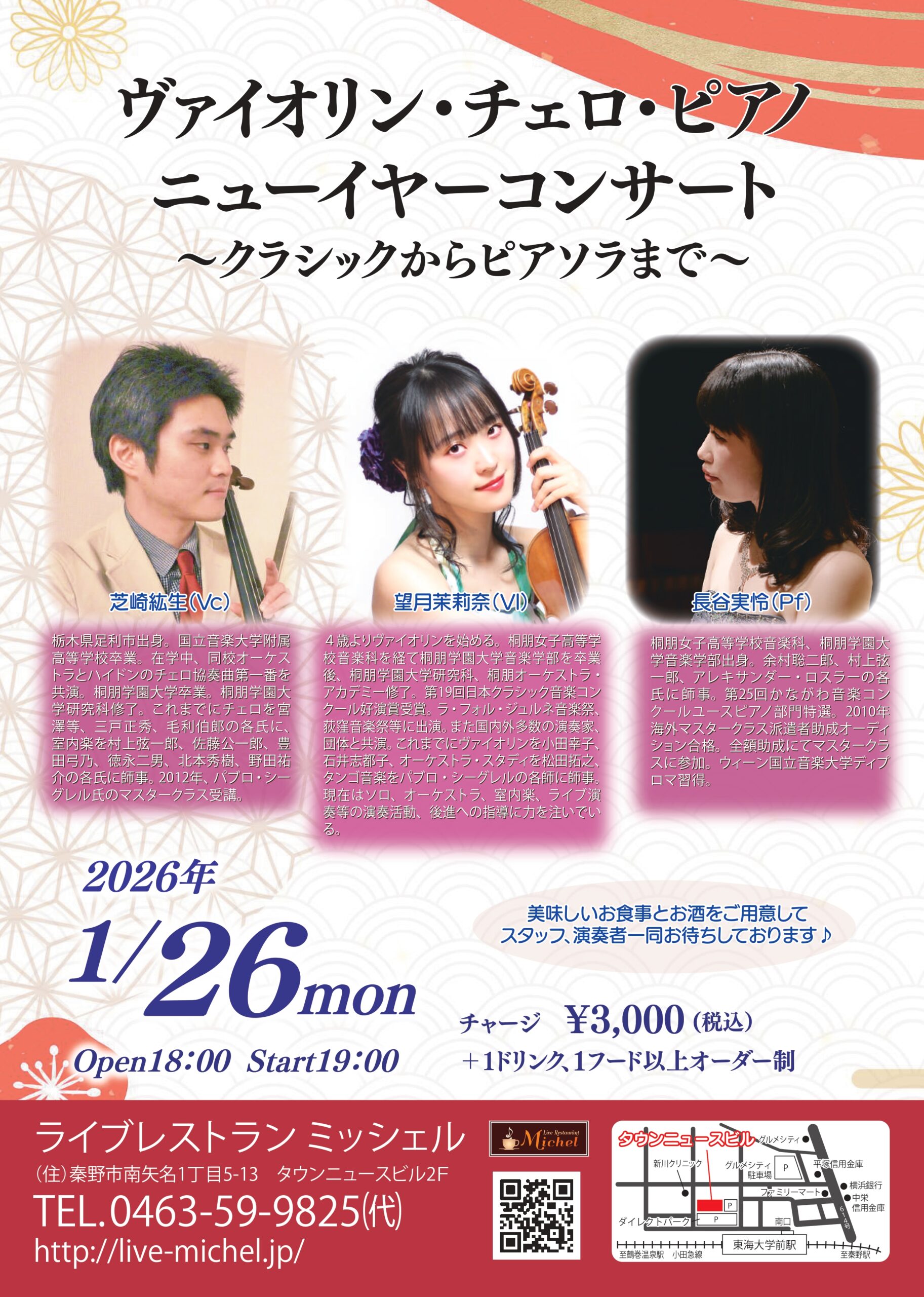 ヴァイオリン、チェロ、ピアノニューイヤーコンサート~クラシックからピアソラまで~ 1月 26 Mon 2026 夜のライブ ヴァイオリンとチェロ、ピアノのトリオによるクラシックライブ! 新年にちなんだクラシックの名曲から、ピアソラ、映画音楽まで幅広くお届け♪ OPEN 18:00 START 19:00 END 21:00 チャージ ¥3,000- +1ドリンク1フードオーダー制 出演 ・望月茉莉奈(Vl) ・芝崎紘生(Vc) ・長谷実怜(Pf) flyer.jpeg flyer.pdf 前のスケジュール