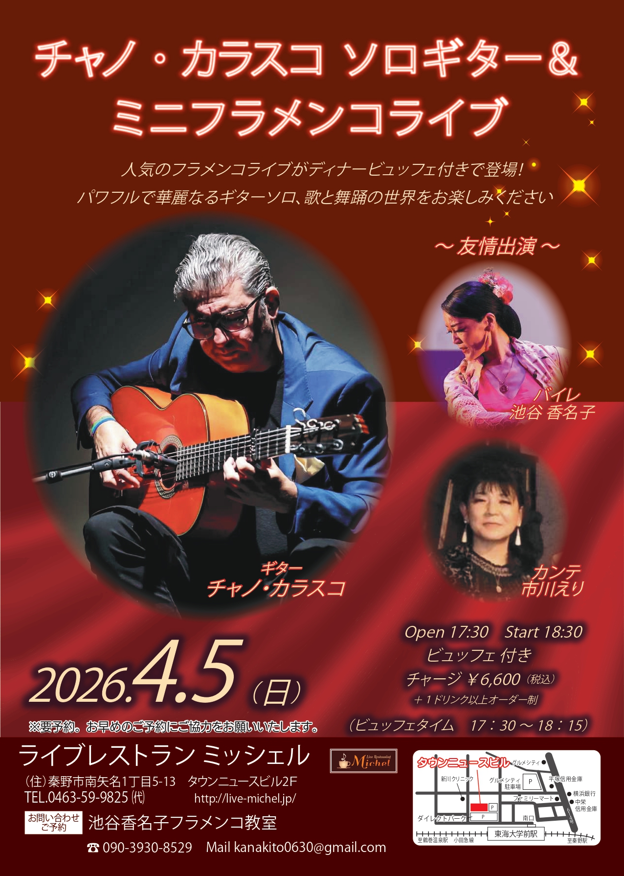 | 出演 | ・チャノ・カラスコ(Gt) ・市川えり(カンテ) ・池谷香名子(MC/バイレ) |