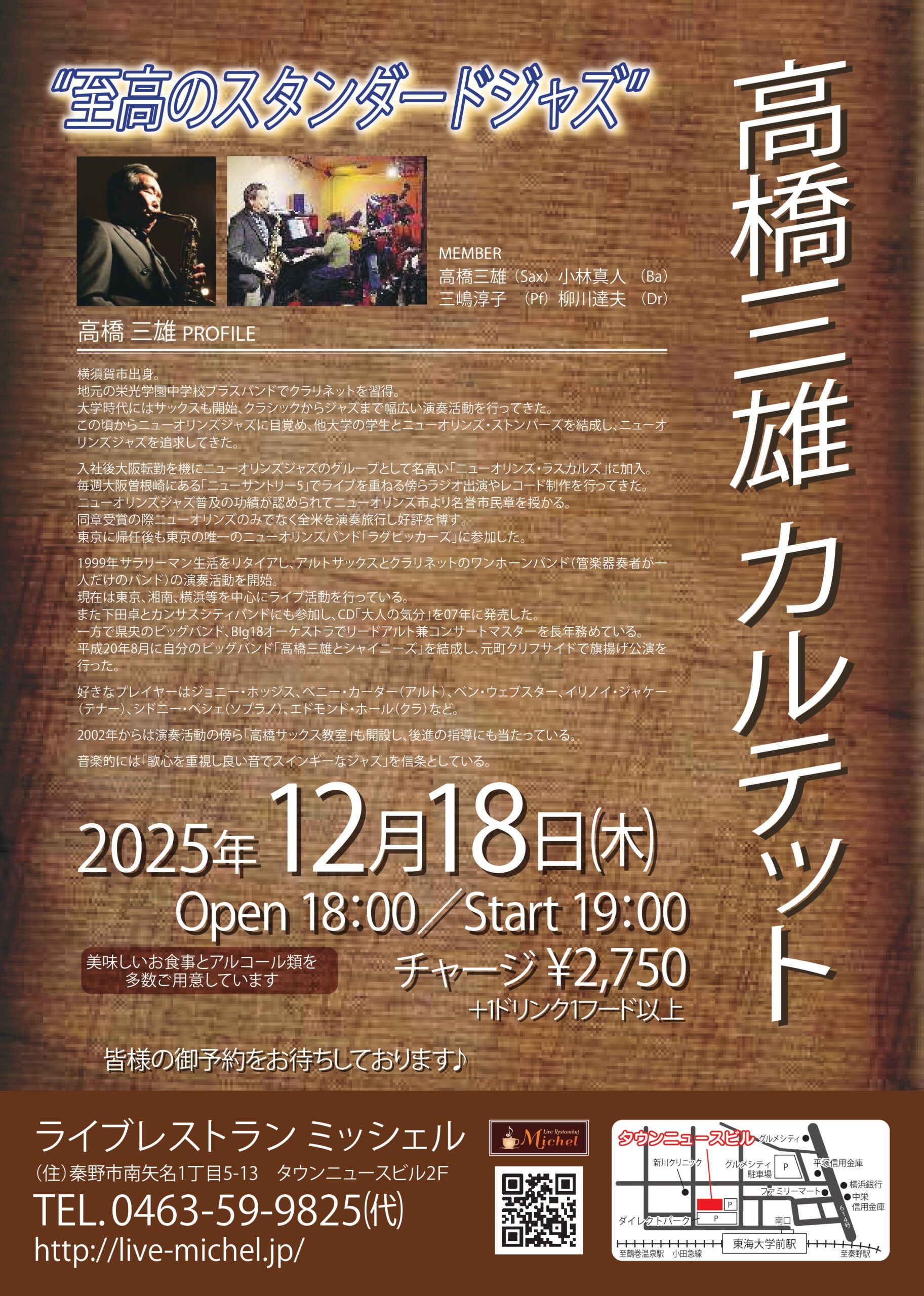 高橋三雄カルテット 12月 18 Thu 2025 夜のライブ ミッシェル大人気のジャズカルテット。 ジャズスタンダードの名曲を演奏予定です♪ ちょっぴり毒舌なMCも人気のバンド。 OPEN 18:00 START 19:00 END 21:00 チャージ ¥2,750- ※別途1ドリンク、1フード以上 出演 ・高橋三雄(Sax) ・小林真人(Ba) ・三嶋淳子(Pf) ・柳川達夫(Dr) flyer.jpeg flyer.pdf 前のスケジュール 次のスケジュール