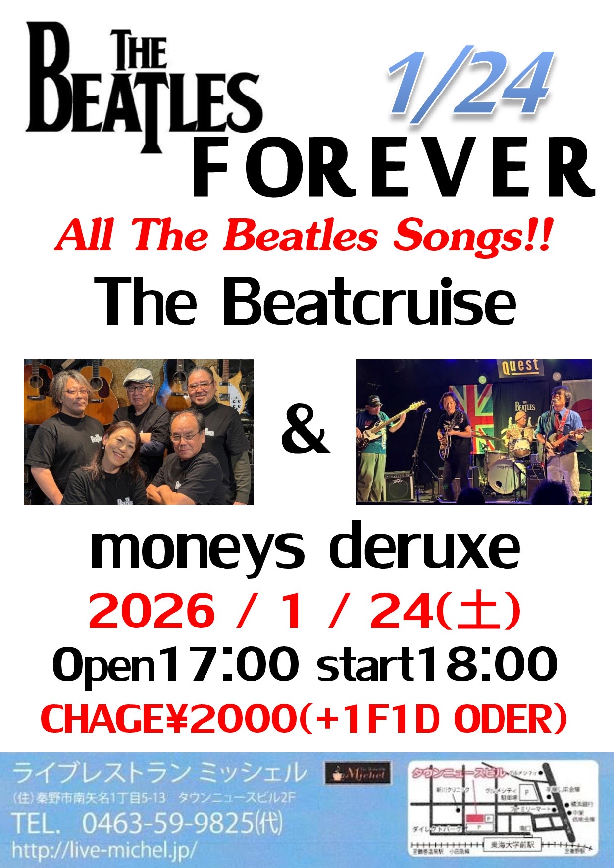 THE BEATLES FOR EVER 1月 24 Sat 2026 夜のライブ ビートルズナンバーをたっぷりお届します! OPEN 17:00 START 18:00 END 20:00 チャージ ¥1,500- ※別途1ドリンク,1フード以上 出演 ・The Beatcruise,moneys deruxe flyer.jpeg flyer.PDF 前のスケジュール 次のスケジュール
